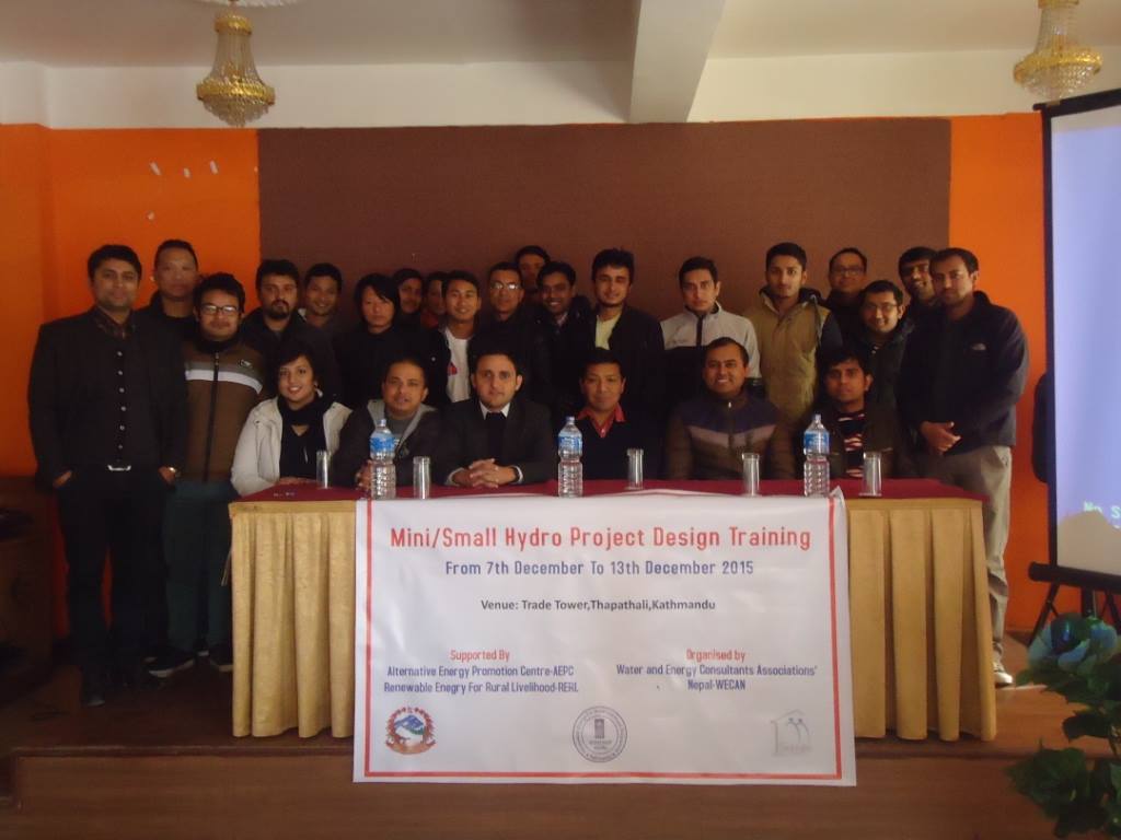 One week training was conducted on "Mini/Small Hydropower Project Design Training" from 7th December 2015 to 13th December 2015. The training program was supported by Alternative Energy Promotion Center(AEPC)/Renewable Energy for Rural Livelihood Program(RERL), Nepal and Organized by WECAN. There were total 24 participants in the program. The course was mainly designed for capacity building of consultant working in the renewable energy sector in Nepal. The key trainer and the training session conducted by them are as follows: